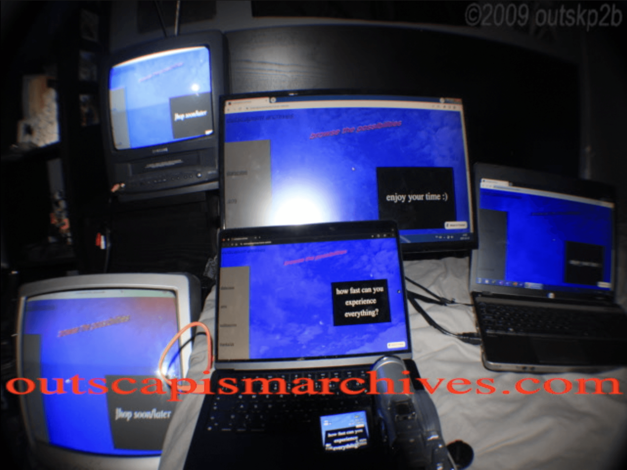 lors de ces balades virtuelles, je photographie des éléments ayant alimenté mon imaginaire d'enfant. je deviens photographe du passé :D je les garde précieusement sur outscapism archives. Ils viennent se mélanger à un autre type de média présent sur le site: des moments capturés à travers ma vision d'adulte. j'utilise au quotidien une caméra digitale HITACHI pour documenter des instants de mon présent qui alimentent mon imaginaire d'adulte. je les modifie par ordinateur afin qu'ils correspondent à la vision que j'en aurait eue en 2009: un média obscur et étrangement réconfortant, never seen before, never to be seen again :D comme ce souvenir lointain d'un endroit à l'existence incertaine et fragmenté. comme cet odeur évoquant une image brouillé malgré son importance certaine. comme cet endroit perdu d'internet dont on se refait le dessein des années plus tard sans raisons précises. l
